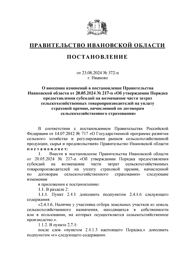 Постановление Правительства Ивановской области от 23.08.2024 N 372-п "О внесении изменений в постановление Правительства Ивановской области от 20.05.2024 N 217-п "Об утверждении Порядка предоставления субсидий на возмещение части затрат сельскохозяйственных товаропроизводителей на уплату страховой премии, начисленной по договорам сельскохозяйственного страхования"