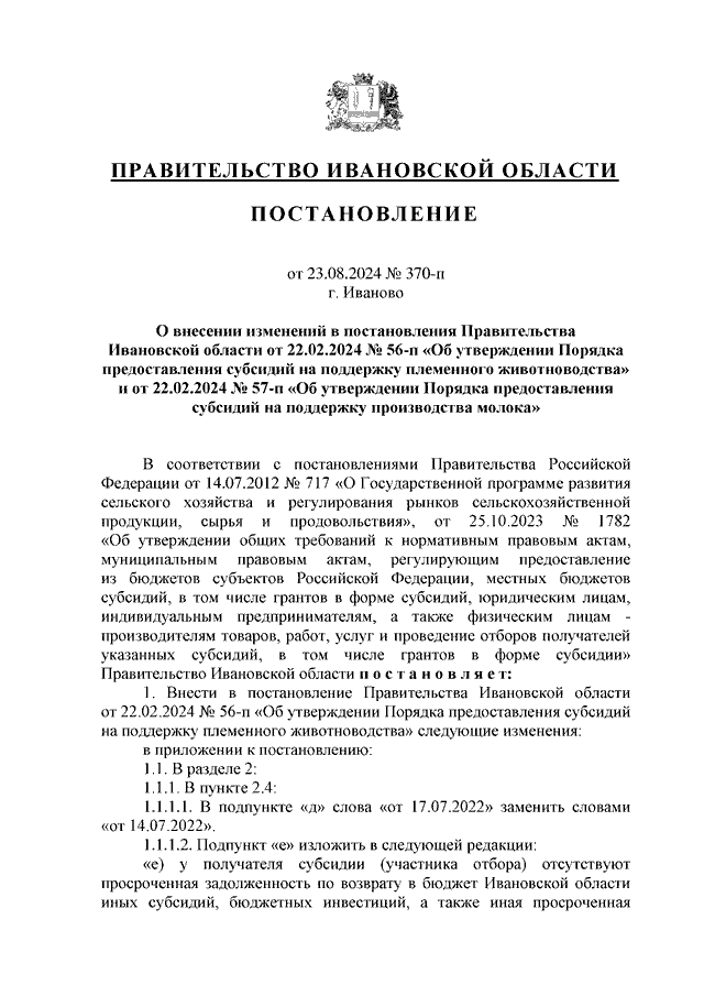Постановление Правительства Ивановской области от 23.08.2024 N 370-п "О внесении изменений в постановления Правительства Ивановской области от 22.02.2024 N 56-п "Об утверждении Порядка предоставления субсидий на поддержку племенного животноводства" и от 22.02.2024 N 57-п "Об утверждении Порядка предоставления субсидий на поддержку производства молока"