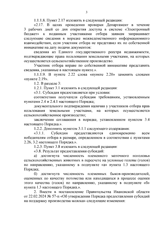 Постановление Правительства Ивановской области от 23.08.2024 N 370-п "О внесении изменений в постановления Правительства Ивановской области от 22.02.2024 N 56-п "Об утверждении Порядка предоставления субсидий на поддержку племенного животноводства" и от 22.02.2024 N 57-п "Об утверждении Порядка предоставления субсидий на поддержку производства молока"