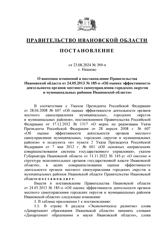 Постановление Правительства Ивановской области от 23.08.2024 N 369-п "О внесении изменений в постановление Правительства Ивановской области от 24.05.2013 N 185-п "Об оценке эффективности деятельности органов местного самоуправления городских округов и муниципальных районов Ивановской области" (вместе с "Классификацией городских округов и муниципальных районов Ивановской области")