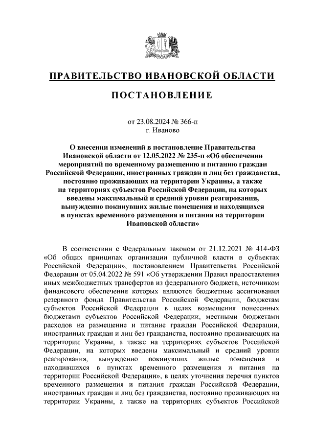 Постановление Правительства Ивановской области от 23.08.2024 N 366-п "О внесении изменений в постановление Правительства Ивановской области от 12.05.2022 N 235-п "Об обеспечении мероприятий по временному размещению и питанию граждан Российской Федерации, иностранных граждан и лиц без гражданства, постоянно проживающих на территории Украины, а также на территориях субъектов Российской Федерации, на которых введены максимальный и средний уровни реагирования, вынужденно покинувших жилые помещения и находящихся в пунктах временного размещения и питания на территории Ивановской области"