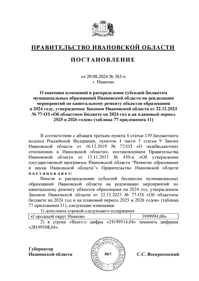 Постановление Правительства Ивановской области от 29.08.2024 N 383-п "О внесении изменений в распределение субсидий бюджетам муниципальных образований Ивановской области на реализацию мероприятий по капитальному ремонту объектов образования в 2024 году, утвержденное Законом Ивановской области от 22.12.2023 N 77-ОЗ "Об областном бюджете на 2024 год и на плановый период 2025 и 2026 годов" (таблица 77 приложения 11)"