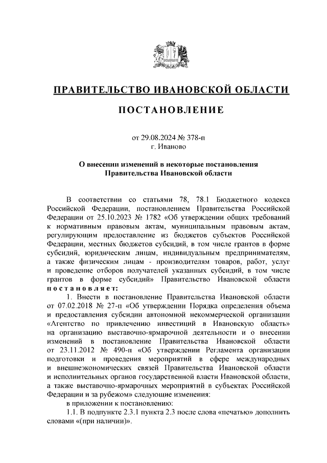 Постановление Правительства Ивановской области от 29.08.2024 N 378-п "О внесении изменений в некоторые постановления Правительства Ивановской области"