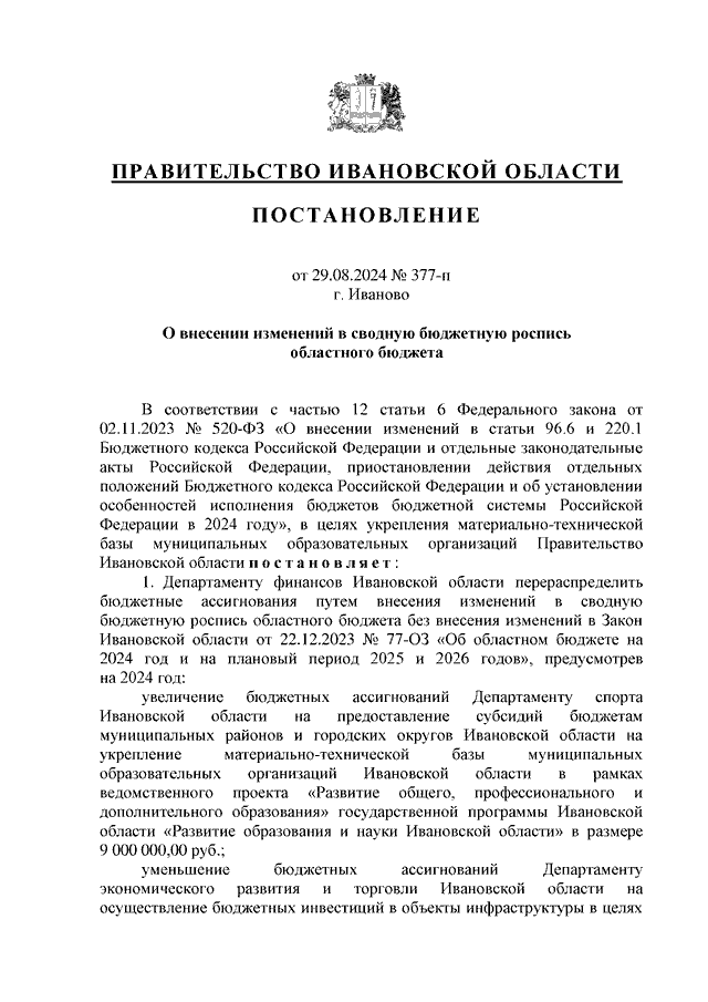 Постановление Правительства Ивановской области от 29.08.2024 N 377-п "О внесении изменений в сводную бюджетную роспись областного бюджета"