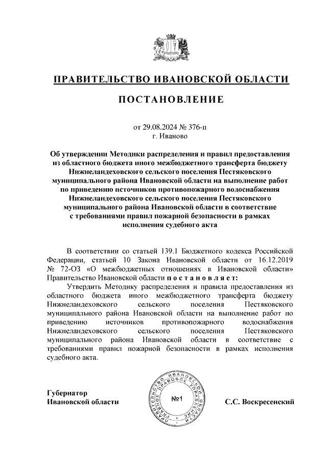 Постановление Правительства Ивановской области от 29.08.2024 N 376-п "Об утверждении Методики распределения и правил предоставления из областного бюджета иного межбюджетного трансферта бюджету Нижнеландеховского сельского поселения Пестяковского муниципального района Ивановской области на выполнение работ по приведению источников противопожарного водоснабжения Нижнеландеховского сельского поселения Пестяковского муниципального района Ивановской области в соответствие с требованиями правил пожарной безопасности в рамках исполнения судебного акта"
