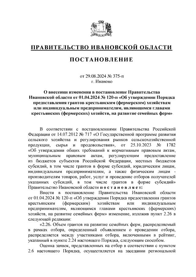 Постановление Правительства Ивановской области от 29.08.2024 N 375-п "О внесении изменения в постановление Правительства Ивановской области от 01.04.2024 N 120-п "Об утверждении Порядка предоставления грантов крестьянским (фермерским) хозяйствам или индивидуальным предпринимателям, являющимся главами крестьянских (фермерских) хозяйств, на развитие семейных ферм"