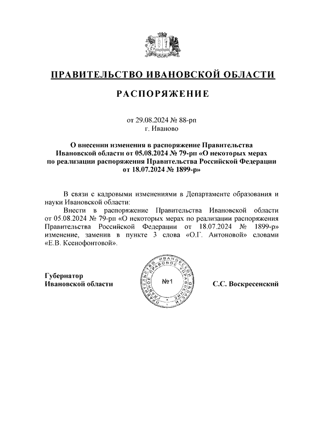 Распоряжение Правительства Ивановской области от 29.08.2024 N 88-рп "О внесении изменения в распоряжение Правительства Ивановской области от 05.08.2024 N 79-рп "О некоторых мерах по реализации распоряжения Правительства Российской Федерации от 18.07.2024 N 1899-р"