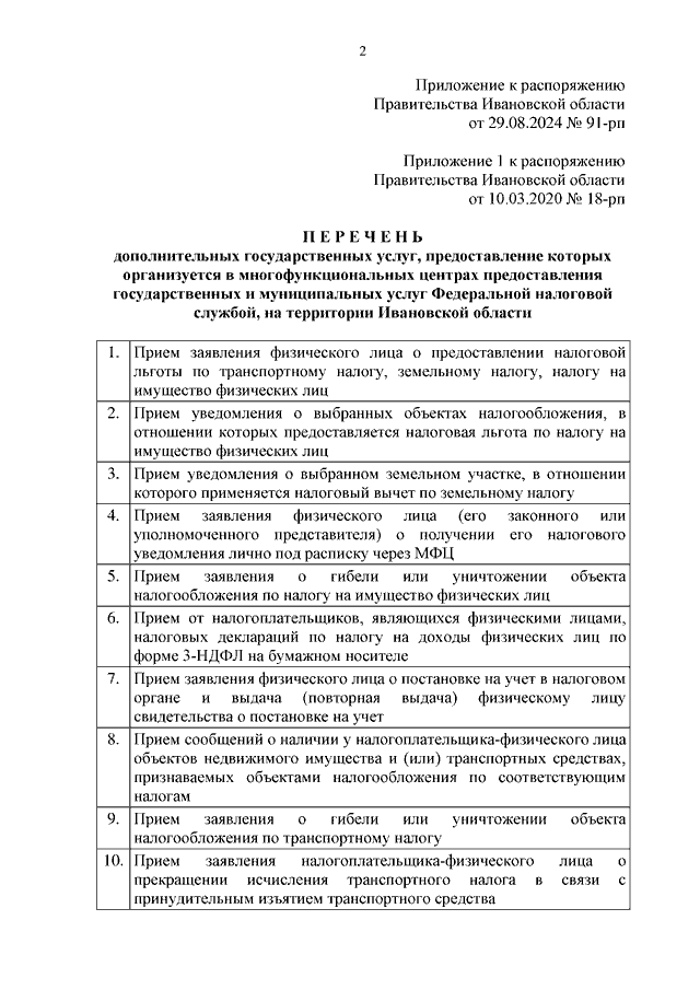 Распоряжение Правительства Ивановской области от 29.08.2024 N 91-рп "О внесении изменения в распоряжение Правительства Ивановской области от 10.03.2020 N 18-рп "Об утверждении перечня дополнительных государственных услуг, предоставление которых организуется в многофункциональных центрах предоставления государственных и муниципальных услуг" (вместе с "Перечнем дополнительных государственных услуг, предоставление которых организуется в многофункциональных центрах предоставления государственных и муниципальных услуг Федеральной налоговой службой, на территории Ивановской области")