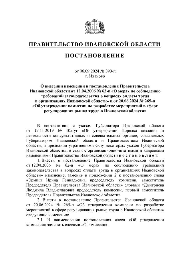 Постановление Правительства Ивановской области от 06.09.2024 N 390-п "О внесении изменений в постановления Правительства Ивановской области от 12.04.2006 N 62-п "О мерах по соблюдению требований законодательства в вопросах оплаты труда в организациях Ивановской области" и от 20.06.2024 N 265-п "Об утверждении комиссии по разработке мероприятий в сфере регулирования рынка труда в Ивановской области"