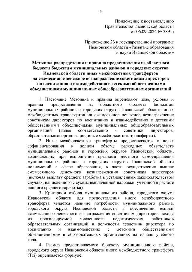 Постановление Правительства Ивановской области от 06.09.2024 N 389-п "О внесении изменений в постановление Правительства Ивановской области от 13.11.2013 N 450-п "Об утверждении государственной программы Ивановской области "Развитие образования и науки Ивановской области" (вместе с "Методикой распределения и правилами предоставления из областного бюджета бюджетам муниципальных районов и городских округов Ивановской области иных межбюджетных трансфертов на ежемесячное денежное вознаграждение советникам директоров по воспитанию и взаимодействию с детскими общественными объединениями муниципальных общеобразовательных организаций")
