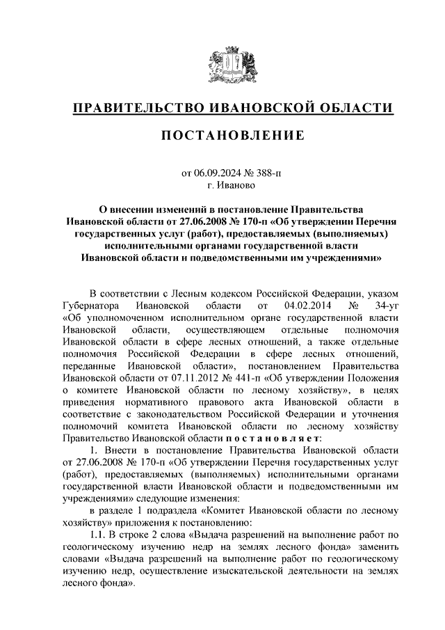 Постановление Правительства Ивановской области от 06.09.2024 N 388-п "О внесении изменений в постановление Правительства Ивановской области от 27.06.2008 N 170-п "Об утверждении Перечня государственных услуг (работ), предоставляемых (выполняемых) исполнительными органами государственной власти Ивановской области и подведомственными им учреждениями"