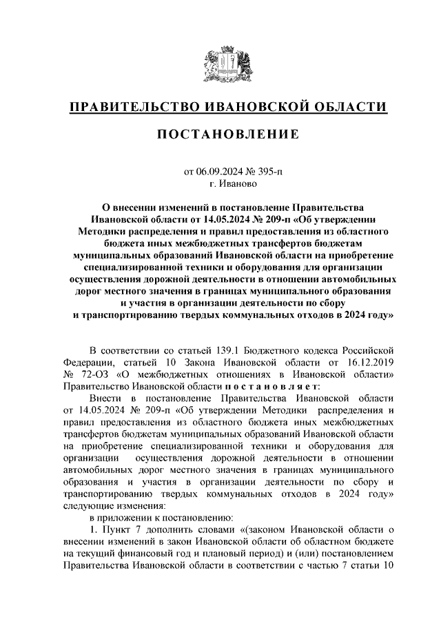 Постановление Правительства Ивановской области от 06.09.2024 N 395-п "О внесении изменений в постановление Правительства Ивановской области от 14.05.2024 N 209-п "Об утверждении Методики распределения и правил предоставления из областного бюджета иных межбюджетных трансфертов бюджетам муниципальных образований Ивановской области на приобретение специализированной техники и оборудования для организации осуществления дорожной деятельности в отношении автомобильных дорог местного значения в границах муниципального образования и участия в организации деятельности по сбору и транспортированию твердых коммунальных отходов в 2024 году"