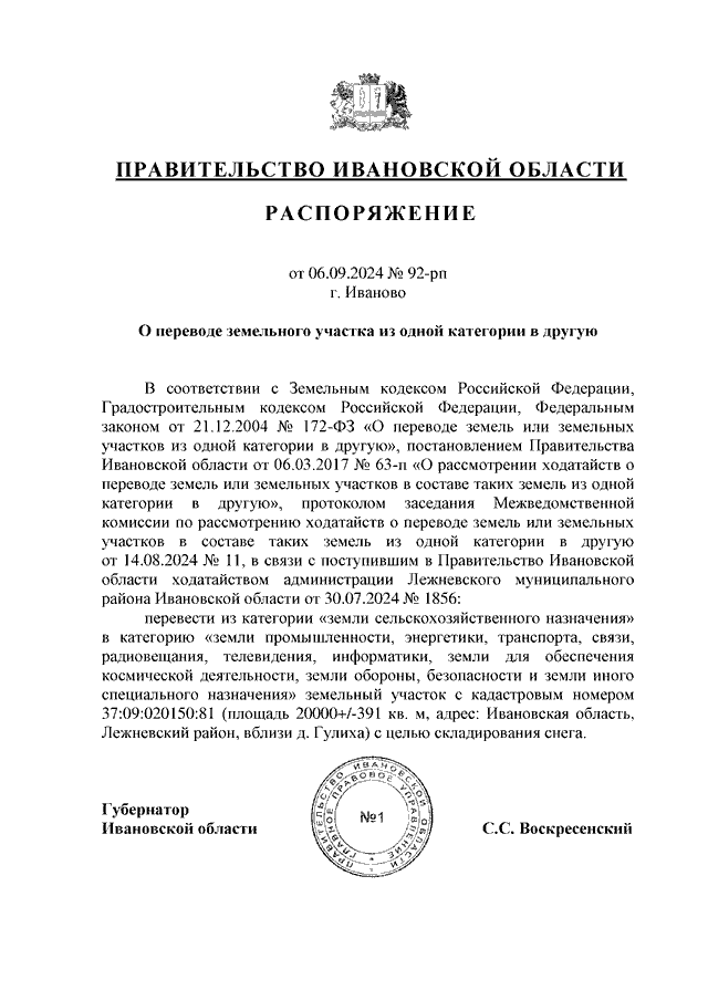 Распоряжение Правительства Ивановской области от 06.09.2024 N 92-рп "О переводе земельного участка из одной категории в другую"