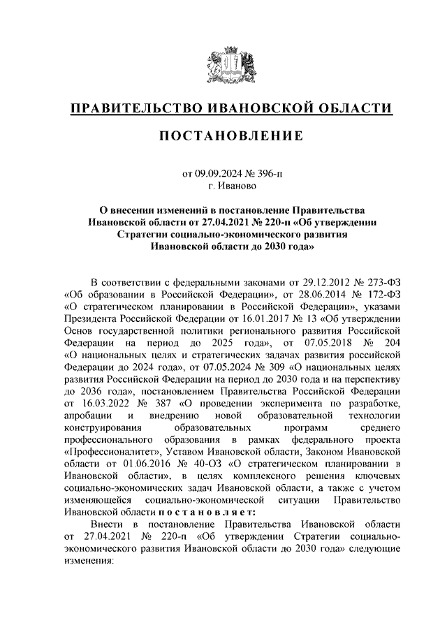 Постановление Правительства Ивановской области от 09.09.2024 N 396-п "О внесении изменений в постановление Правительства Ивановской области от 27.04.2021 N 220-п "Об утверждении Стратегии социально-экономического развития Ивановской области до 2030 года"