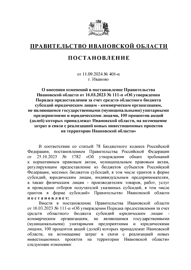 Постановление Правительства Ивановской области от 11.09.2024 N 401-п "О внесении изменений в постановление Правительства Ивановской области от 16.03.2023 N 111-п "Об утверждении Порядка предоставления за счет средств областного бюджета субсидий юридическим лицам - коммерческим организациям, не являющимся государственными (муниципальными) унитарными предприятиями и юридическими лицами, 100 процентов акций (долей) которых принадлежат Ивановской области, на возмещение затрат в связи с реализацией новых инвестиционных проектов на территории Ивановской области"