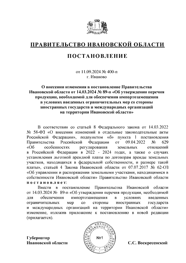Постановление Правительства Ивановской области от 11.09.2024 N 400-п "О внесении изменения в постановление Правительства Ивановской области от 14.03.2024 N 89-п "Об утверждении перечня продукции, необходимой для обеспечения импортозамещения в условиях введенных ограничительных мер со стороны иностранных государств и международных организаций на территории Ивановской области"