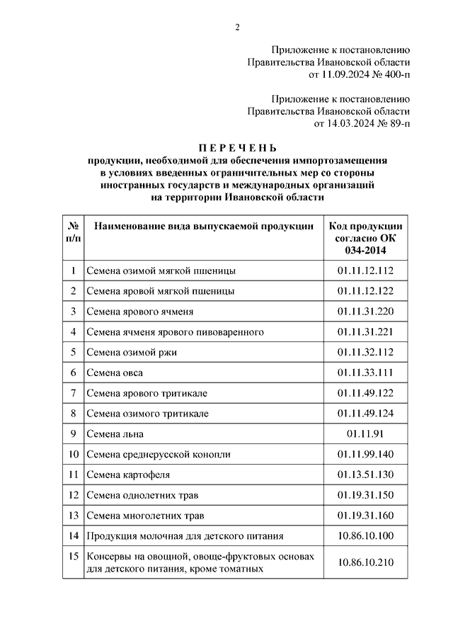 Постановление Правительства Ивановской области от 11.09.2024 N 400-п "О внесении изменения в постановление Правительства Ивановской области от 14.03.2024 N 89-п "Об утверждении перечня продукции, необходимой для обеспечения импортозамещения в условиях введенных ограничительных мер со стороны иностранных государств и международных организаций на территории Ивановской области"