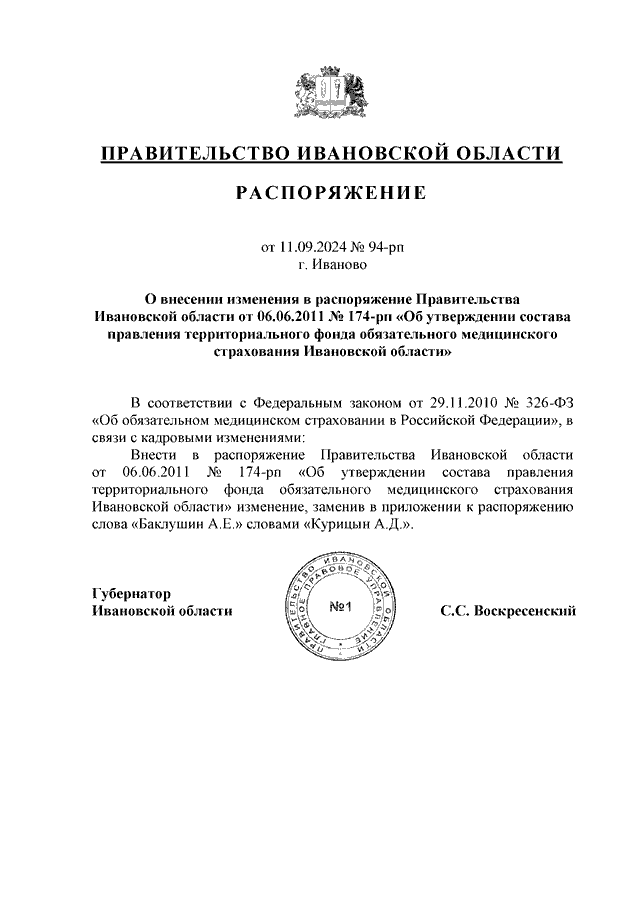 Распоряжение Правительства Ивановской области от 11.09.2024 N 94-рп "О внесении изменения в распоряжение Правительства Ивановской области от 06.06.2011 N 174-рп "Об утверждении состава правления территориального фонда обязательного медицинского страхования Ивановской области"