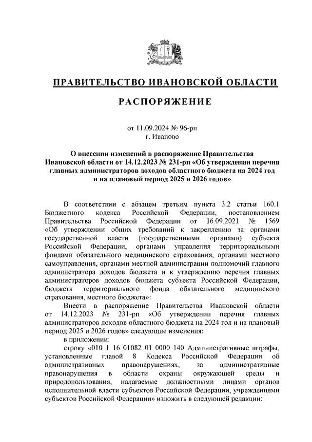 Распоряжение Правительства Ивановской области от 11.09.2024 N 96-рп "О внесении изменений в распоряжение Правительства Ивановской области от 14.12.2023 N 231-рп "Об утверждении перечня главных администраторов доходов областного бюджета на 2024 год и на плановый период 2025 и 2026 годов"