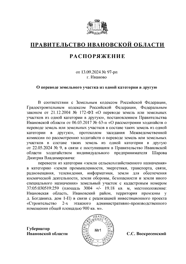 Распоряжение Правительства Ивановской области от 13.09.2024 N 97-рп "О переводе земельного участка из одной категории в другую"