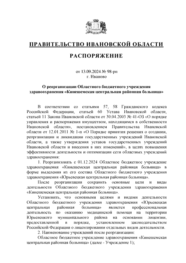 Распоряжение Правительства Ивановской области от 13.09.2024 N 98-рп "О реорганизации Областного бюджетного учреждения здравоохранения "Кинешемская центральная районная больница"