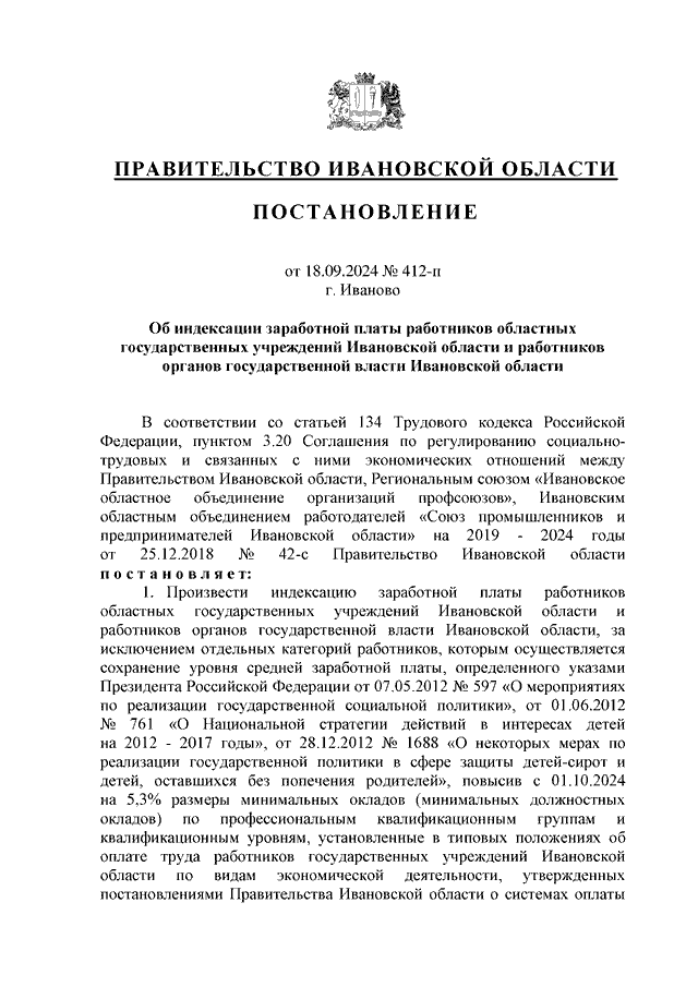 Постановление Правительства Ивановской области от 18.09.2024 N 412-п "Об индексации заработной платы работников областных государственных учреждений Ивановской области и работников органов государственной власти Ивановской области"