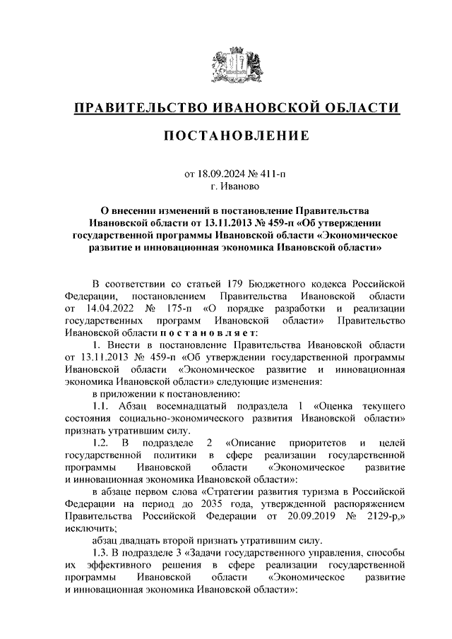 Постановление Правительства Ивановской области от 18.09.2024 N 411-п "О внесении изменений в постановление Правительства Ивановской области от 13.11.2013 N 459-п "Об утверждении государственной программы Ивановской области "Экономическое развитие и инновационная экономика Ивановской области"