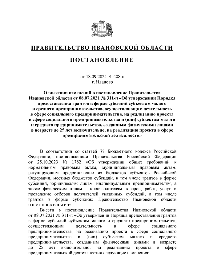 Постановление Правительства Ивановской области от 18.09.2024 N 408-п "О внесении изменений в постановление Правительства Ивановской области от 08.07.2021 N 311-п "Об утверждении Порядка предоставления грантов в форме субсидий субъектам малого и среднего предпринимательства, осуществляющим деятельность в сфере социального предпринимательства, на реализацию проекта в сфере социального предпринимательства и (или) субъектам малого и среднего предпринимательства, созданным физическими лицами в возрасте до 25 лет включительно, на реализацию проекта в сфере предпринимательской деятельности"