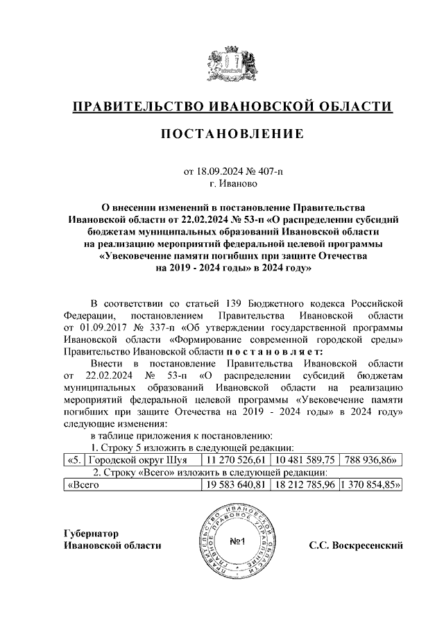 Постановление Правительства Ивановской области от 18.09.2024 N 407-п "О внесении изменений в постановление Правительства Ивановской области от 22.02.2024 N 53-п "О распределении субсидий бюджетам муниципальных образований Ивановской области на реализацию мероприятий федеральной целевой программы "Увековечение памяти погибших при защите Отечества на 2019 - 2024 годы" в 2024 году"