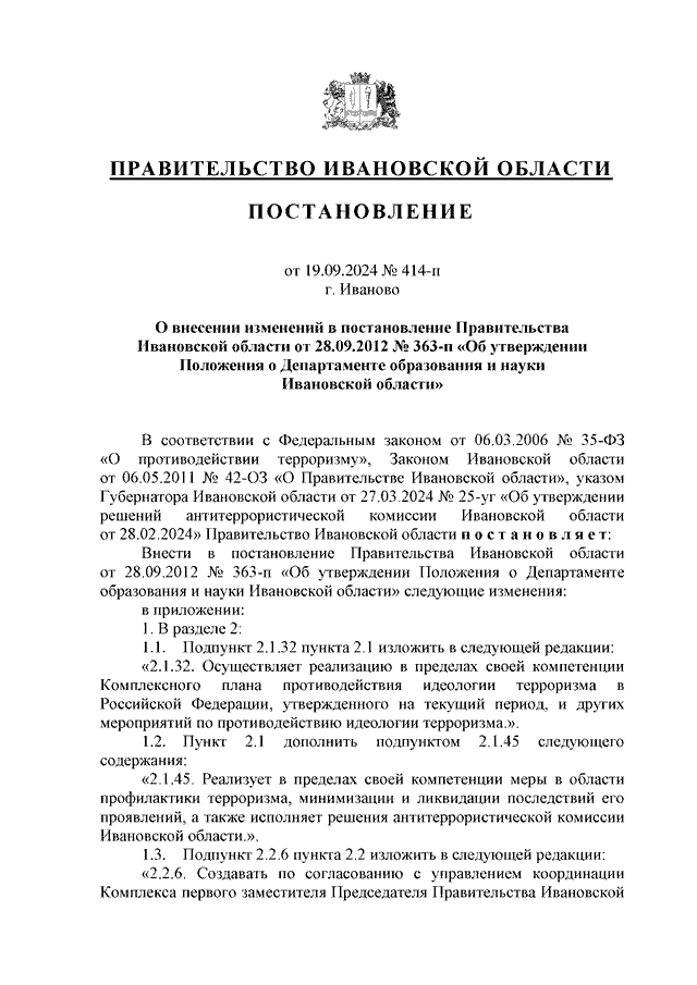 Постановление Правительства Ивановской области от 19.09.2024 N 414-п "О внесении изменений в постановление Правительства Ивановской области от 28.09.2012 N 363-п "Об утверждении Положения о Департаменте образования и науки Ивановской области"