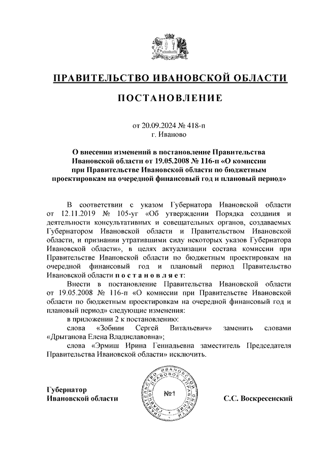 Постановление Правительства Ивановской области от 20.09.2024 N 418-п "О внесении изменений в постановление Правительства Ивановской области от 19.05.2008 N 116-п "О комиссии при Правительстве Ивановской области по бюджетным проектировкам на очередной финансовый год и плановый период"