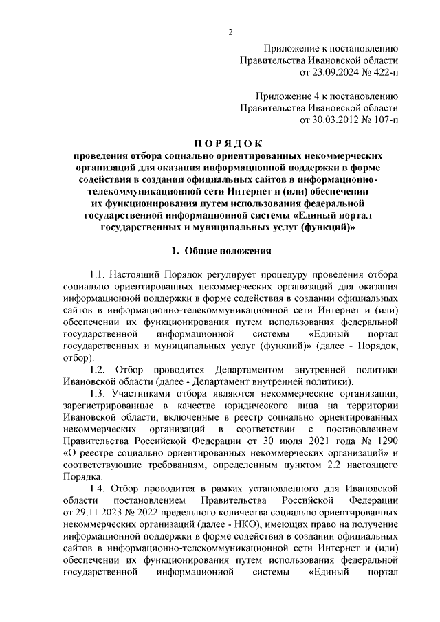 Постановление Правительства Ивановской области от 23.09.2024 N 422-п "О внесении изменения в постановление Правительства Ивановской области от 30.03.2012 N 107-п "О порядке, объемах и условиях предоставления поддержки социально ориентированным некоммерческим организациям, зарегистрированным и действующим на территории Ивановской области" (вместе с "Порядком проведения отбора социально ориентированных некоммерческих организаций для оказания информационной поддержки в форме содействия в создании официальных сайтов в информационно-телекоммуникационной сети Интернет и (или) обеспечении их функционирования путем использования федеральной государственной информационной системы "Единый портал государственных и муниципальных услуг (функций)")