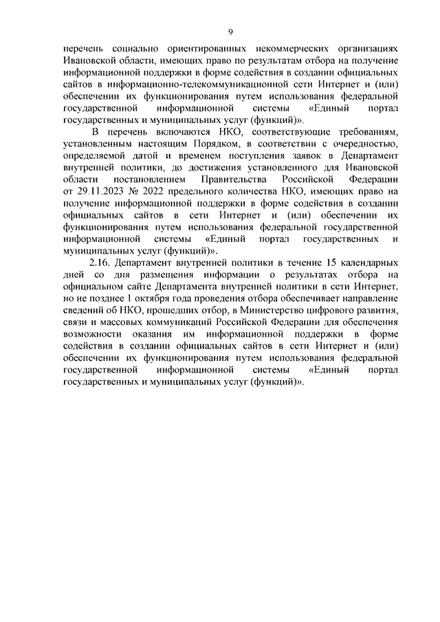 Постановление Правительства Ивановской области от 23.09.2024 N 422-п "О внесении изменения в постановление Правительства Ивановской области от 30.03.2012 N 107-п "О порядке, объемах и условиях предоставления поддержки социально ориентированным некоммерческим организациям, зарегистрированным и действующим на территории Ивановской области" (вместе с "Порядком проведения отбора социально ориентированных некоммерческих организаций для оказания информационной поддержки в форме содействия в создании официальных сайтов в информационно-телекоммуникационной сети Интернет и (или) обеспечении их функционирования путем использования федеральной государственной информационной системы "Единый портал государственных и муниципальных услуг (функций)")