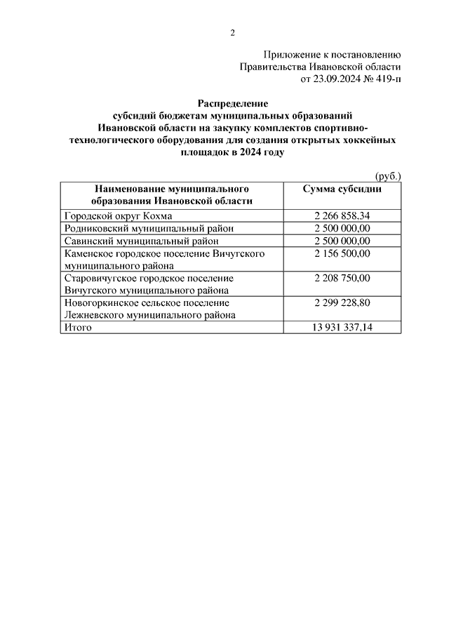 Постановление Правительства Ивановской области от 23.09.2024 N 419-п "О распределении субсидий бюджетам муниципальных образований Ивановской области на закупку комплектов спортивно-технологического оборудования для создания открытых хоккейных площадок в 2024 году"