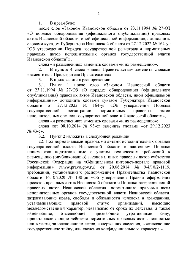 Распоряжение Правительства Ивановской области от 23.09.2024 N 101-рп "О внесении изменений в распоряжение Правительства Ивановской области от 17.05.2017 N 75-рп "Об утверждении Порядка предоставления исполнительными органами государственной власти Ивановской области электронных образов контрольных экземпляров нормативных правовых актов для размещения (опубликования) на "Официальном интернет-портале правовой информации" (www.pravo.gov.ru)"