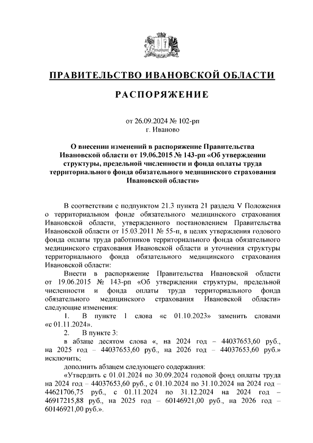 Распоряжение Правительства Ивановской области от 26.09.2024 N 102-рп "О внесении изменений в распоряжение Правительства Ивановской области от 19.06.2015 N 143-рп "Об утверждении структуры, предельной численности и фонда оплаты труда территориального фонда обязательного медицинского страхования Ивановской области"