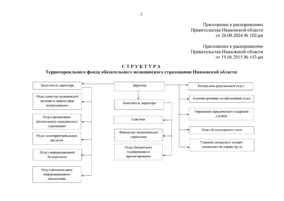 Распоряжение Правительства Ивановской области от 26.09.2024 N 102-рп "О внесении изменений в распоряжение Правительства Ивановской области от 19.06.2015 N 143-рп "Об утверждении структуры, предельной численности и фонда оплаты труда территориального фонда обязательного медицинского страхования Ивановской области"