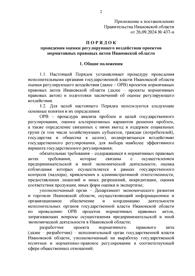 Постановление Правительства Ивановской области от 26.09.2024 N 437-п "О внесении изменения в постановление Правительства Ивановской области от 17.12.2013 N 534-п "Об оценке регулирующего воздействия проектов нормативных правовых актов Ивановской области" (вместе с "Порядком проведения оценки регулирующего воздействия проектов нормативных правовых актов Ивановской области")