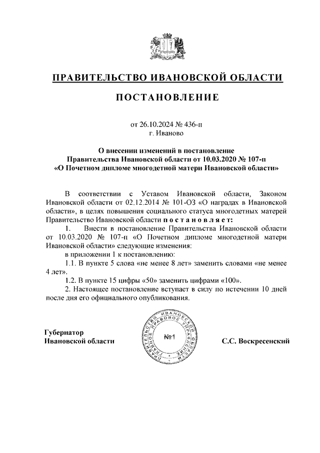 Постановление Правительства Ивановской области от 26.09.2024 N 436-п "О внесении изменений в постановление Правительства Ивановской области от 10.03.2020 N 107-п "О Почетном дипломе многодетной матери Ивановской области"