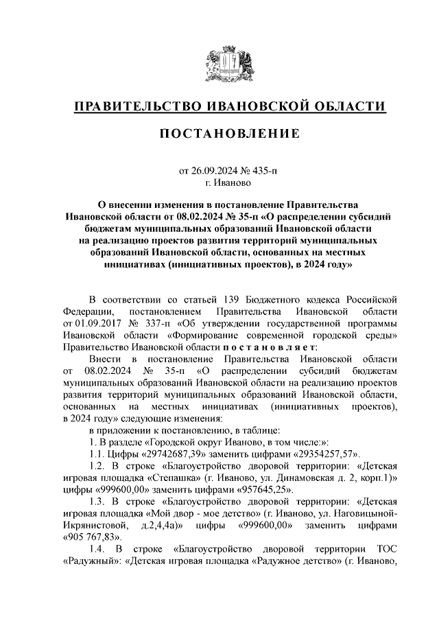 Постановление Правительства Ивановской области от 26.09.2024 N 435-п "О внесении изменения в постановление Правительства Ивановской области от 08.02.2024 N 35-п "О распределении субсидий бюджетам муниципальных образований Ивановской области на реализацию проектов развития территорий муниципальных образований Ивановской области, основанных на местных инициативах (инициативных проектов), в 2024 году"