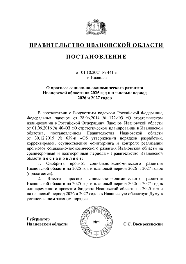 Постановление Правительства Ивановской области от 01.10.2024 N 441-п "О прогнозе социально-экономического развития Ивановской области на 2025 год и плановый период 2026 и 2027 годов"