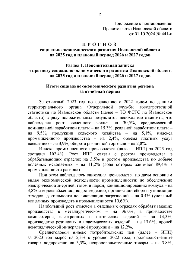 Постановление Правительства Ивановской области от 01.10.2024 N 441-п "О прогнозе социально-экономического развития Ивановской области на 2025 год и плановый период 2026 и 2027 годов"