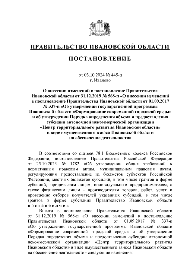 Постановление Правительства Ивановской области от 03.10.2024 N 445-п "О внесении изменений в постановление Правительства Ивановской области от 31.12.2019 N 568-п "О внесении изменений в постановление Правительства Ивановской области от 01.09.2017 N 337-п "Об утверждении государственной программы Ивановской области "Формирование современной городской среды" и об утверждении Порядка определения объема и предоставления субсидии автономной некоммерческой организации "Центр территориального развития Ивановской области" в виде имущественного взноса Ивановской области на обеспечение деятельности"