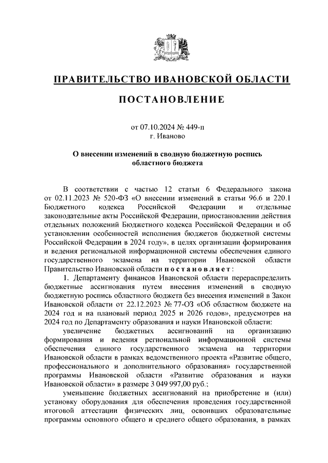 Постановление Правительства Ивановской области от 07.10.2024 N 449-п "О внесении изменений в сводную бюджетную роспись областного бюджета"