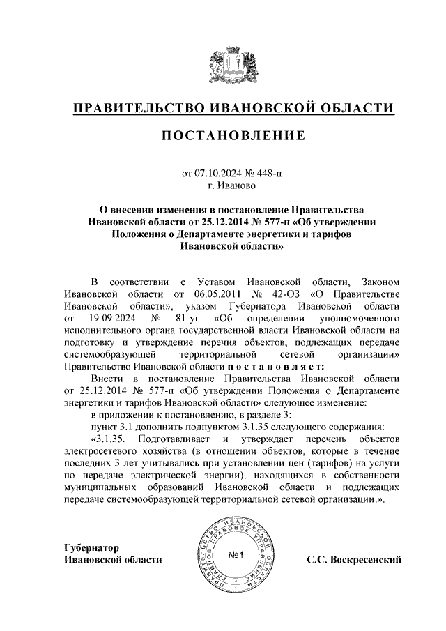 Постановление Правительства Ивановской области от 07.10.2024 N 448-п "О внесении изменения в постановление Правительства Ивановской области от 25.12.2014 N 577-п "Об утверждении Положения о Департаменте энергетики и тарифов Ивановской области"