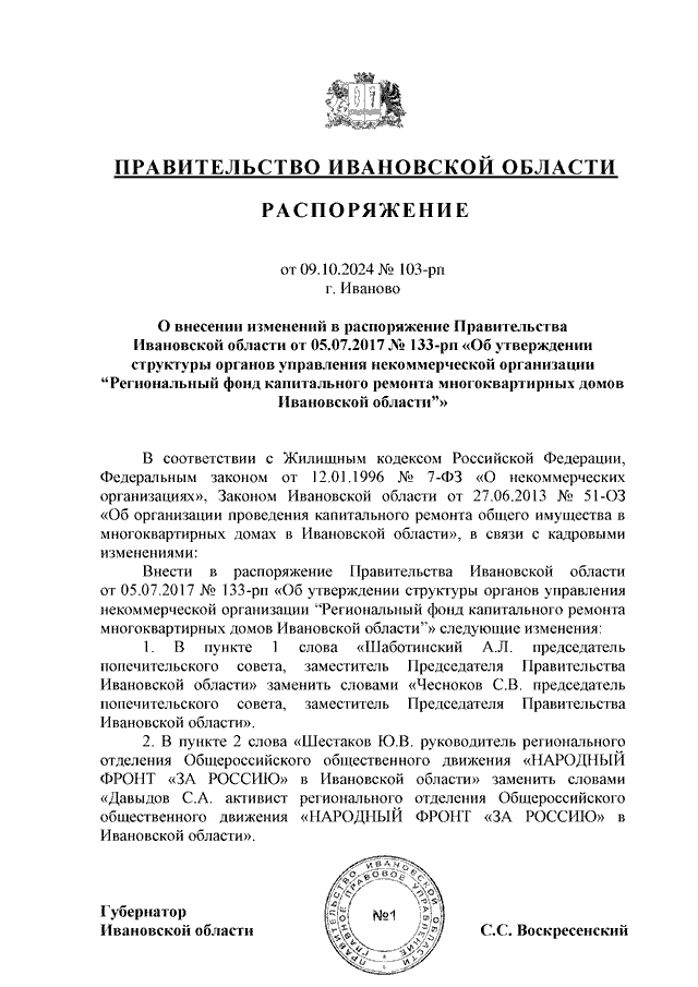 Распоряжение Правительства Ивановской области от 09.10.2024 N 103-рп "О внесении изменений в распоряжение Правительства Ивановской области от 05.07.2017 N 133-рп "Об утверждении структуры органов управления некоммерческой организации "Региональный фонд капитального ремонта многоквартирных домов Ивановской области"