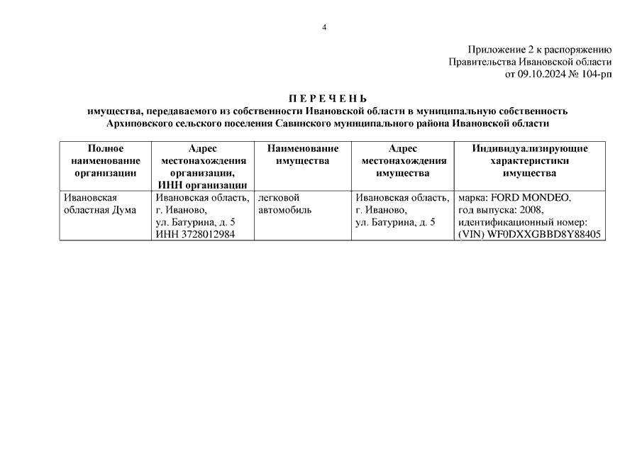 Распоряжение Правительства Ивановской области от 09.10.2024 N 104-рп "О передаче из собственности Ивановской области в муниципальную собственность муниципальных образований Ивановской области транспортных средств"