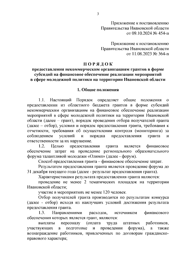 Постановление Правительства Ивановской области от 09.10.2024 N 454-п "О внесении изменений в постановление Правительства Ивановской области от 11.08.2023 N 364-п "О Порядке предоставления некоммерческим организациям грантов в форме субсидий на финансовое обеспечение реализации мероприятий в сфере молодежной политики на территории Ивановской области"
