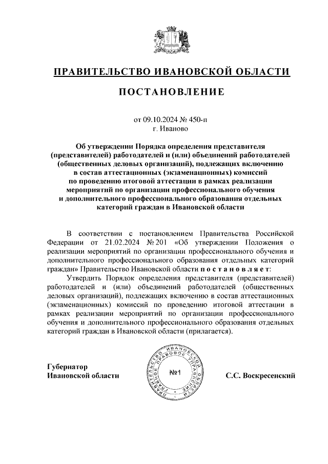 Постановление Правительства Ивановской области от 09.10.2024 N 450-п "Об утверждении Порядка определения представителя (представителей) работодателей и (или) объединений работодателей (общественных деловых организаций), подлежащих включению в состав аттестационных (экзаменационных) комиссий по проведению итоговой аттестации в рамках реализации мероприятий по организации профессионального обучения и дополнительного профессионального образования отдельных категорий граждан в Ивановской области"