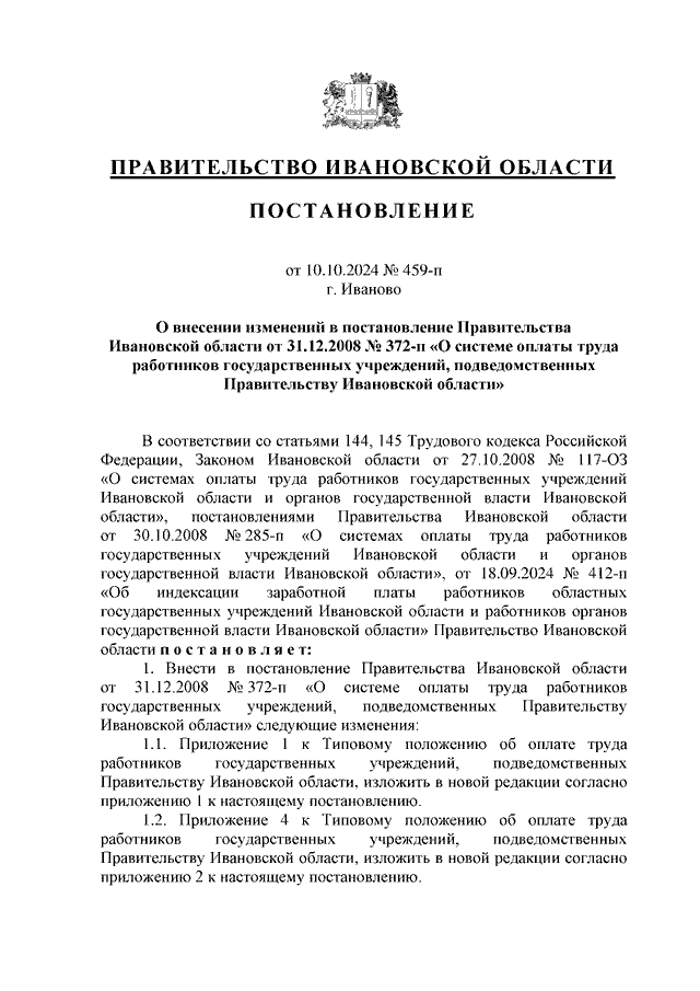 Постановление Правительства Ивановской области от 10.10.2024 N 459-п "О внесении изменений в постановление Правительства Ивановской области от 31.12.2008 N 372-п "О системе оплаты труда работников государственных учреждений, подведомственных Правительству Ивановской области" (вместе с "Перечнем профессиональных квалификационных групп должностей работников государственных учреждений, подведомственных Правительству Ивановской области")